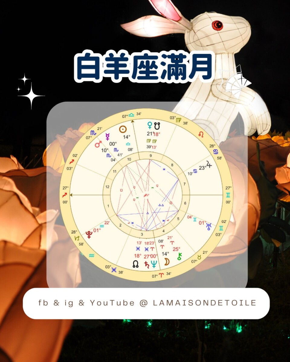 這次的滿月發生在白羊座14度,對相天秤座14度的太陽,強烈凸顯「我與他人」、「自我主張 vs 關係妥協」的課題。在這段時間,我們容易感受到內在衝動被激發,渴望突破、行動、表達自我,但同時也會面對來自外界(尤其是親密關係)對我們的回應與反饋。